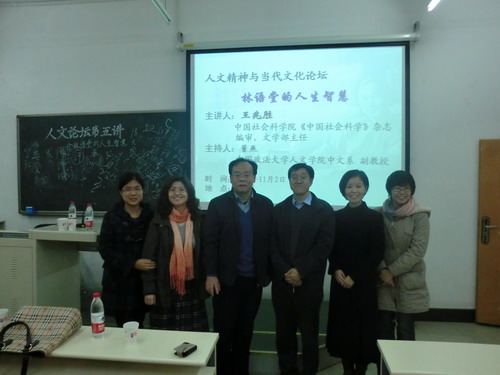 2011年11月2日晚,由中国政法大学“人文精神与当代文化”青年教师学术创新团队主办的人文精神与当代文化论坛第一讲、人文论坛第五讲在昌平校区端升楼103教室举行。本次讲座由中国社会科皇冠官网 《中国社会科学》杂志编审、文学部主任王兆胜老师担任主讲,主题为“林语堂的人生智慧”。皇冠体育官网 中文系董燕副教授主持讲座。