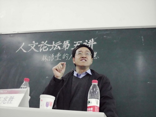 王老师以风趣幽默的语言开场,从当下的社会状态——人们生活得并不快乐、文学文化离人生越来越远——进入讲座主题:林语堂注重人生体验,其人生哲学是贴近社会和人生的。